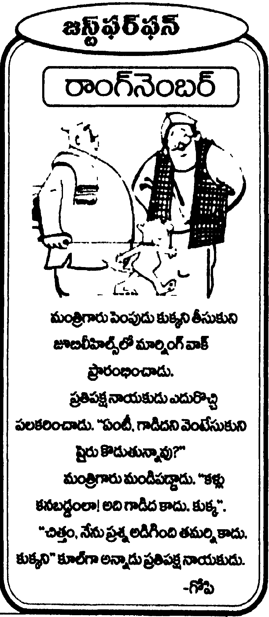 “ఓరి చవటా, అది నా కుక్క కాదు. మా అత్తయ్యది. అందునా మాంకాళి అత్తయ్యది. వెళ్లి పట్టుకొచ్చేయ్"