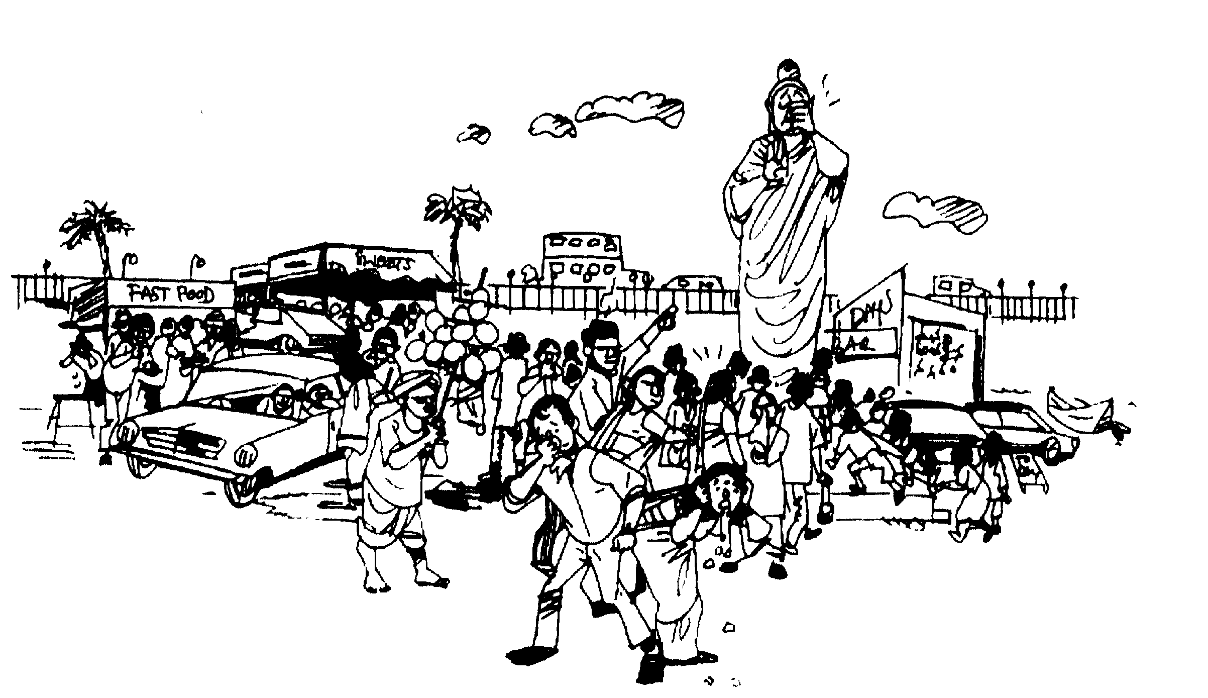 “ అర్రె... బుద్ధ విగ్రహం... హుస్సేన్ సాగర్ మధ్యలో కదా బుద్ధ విగ్రహం... యిదేంటి చుట్టూ కార్లు, బస్సులు, స్కూటర్లు వున్నాయి...!? మరింత ఆశ్చర్యంగా అన్నాడు ప్రసాదబాబు