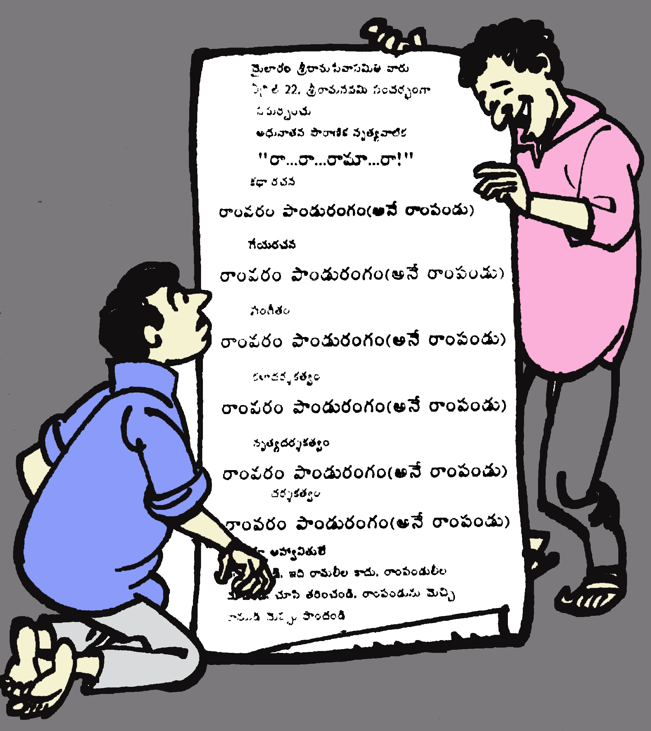 “ ఒరేయ్, 'శ్రీరామజయం ' అనే పేరు ఓల్డ్ స్టయిల్ లో లేదూ, సపోజింగ్, రా... రా... రామా...రా ! అని పెడితే మోడ్రన్ టచ్ ఇచ్చినట్టూ ఉండదూ "అని. సమాధానంగా అనంత్ వినిపించిన తిట్లు వినబడ్డాయో లేదో తెలియదు గానీ మూడో రోజుకి పోస్టులో ఒక పెద్ద వాల్ పోస్టర్ వచ్చింది. మైలారం శ్రీరామ సేవా సమితి ఏప్రిల్ 22, శ్రీరామనవమి సందర్భంగా సమర్పించు అధునాతన పౌరాణిక నృత్య నాటిక " రా...రా...రామా...రా !”. కథా రచన - రాంవరం పాండురంగం (అనే రాంపండు ), గేయ రచన - రాంవరం పాండురంగం (అనే రాంపండు ), సంగీతం - రాంవరం పాండురంగం (అనే రాంపండు ), కళాదర్శకత్వం - రాంవరం పాండురంగం (అనే రాంపండు ), నృత్య దర్శకత్వం - రాంవరం పాండురంగం (అనే రాంపండు ), సాయంత్రం 7గం !!లకు రంగనాయకులు ఆడిటోరియంలో అందరూ ఆహ్వానితులే రండి, రండి, ఇది రామలీల కాదు, రాంపండు లీల.చూడండి, చూసి తరించండి, రాంపండును మెచ్చి రాముడి మెప్పు పొందండి. పోస్టర్ ను పూర్తిగా చదివేక " ఆచలపతీ, మన రాంపండుకి ఇంత కీర్తికాంక్ష ఉందని తెలియదు సుమా " అన్నాడు అనంత్ తెల్లబోతూ.