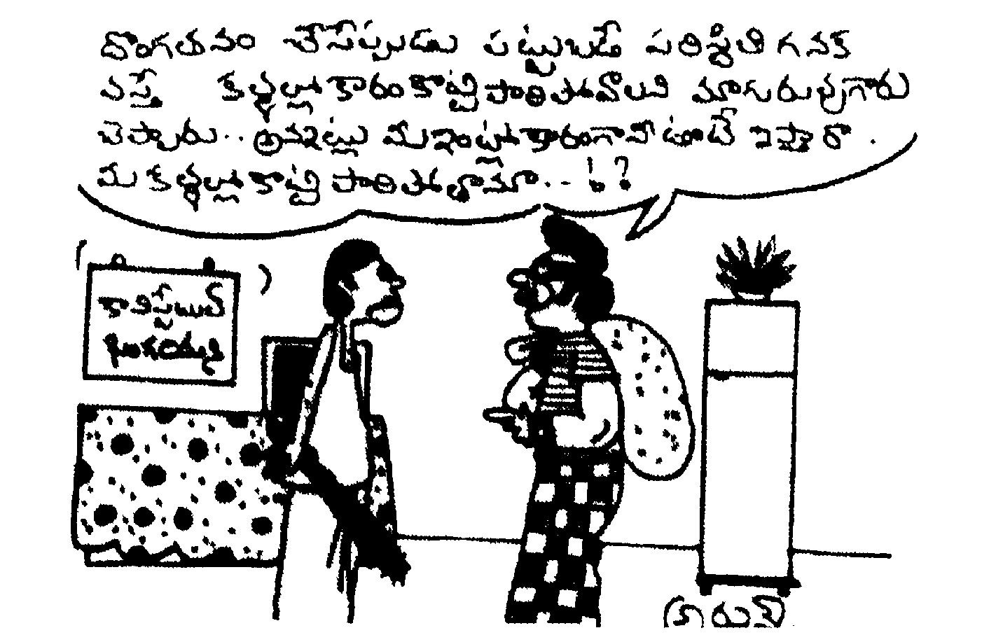 “ స్ట్రీట్ లైట్ కాంతిలో స్కూటరు నీడ గీత దాటితే దానికే పైనేమిటండి నాబొంద ! అలా చూడండి...పొడవంత కారు రోడ్డు మీదే పార్క్ చేశారు.వాళ్ళనేమీ చెయ్యరు.మేమే లోకువ !” ఉక్రోషంగా అన్నాడు సుబ్బారావు. “ కారా " ఏదీ ? నాకు కనబడదేం ? అయినా మాకు కార్ బ్లయిండ్ నేన్సుంటుందిలే. నీ మంచి కోసమే చెబుతున్నా...నాతో మాట్లాడితే మాట్లాడవు కాని. ఎప్పుడూ అలా మాట్లాడకు. పోలీసులకు ఎదురు ప్రశ్నలేయకు !పోటా కింద ఆరెస్ట్ చేసేస్తారు.నేను మంచివాడిని కాబట్టి సరిపోయింది.నువ్వైనా చెప్పు చెల్లెమ్మా " అంటూ స్కూటర్ ఇంజన్ డోరు తీసే ప్రయత్నం చేయసాగాడు పోలీసతను.