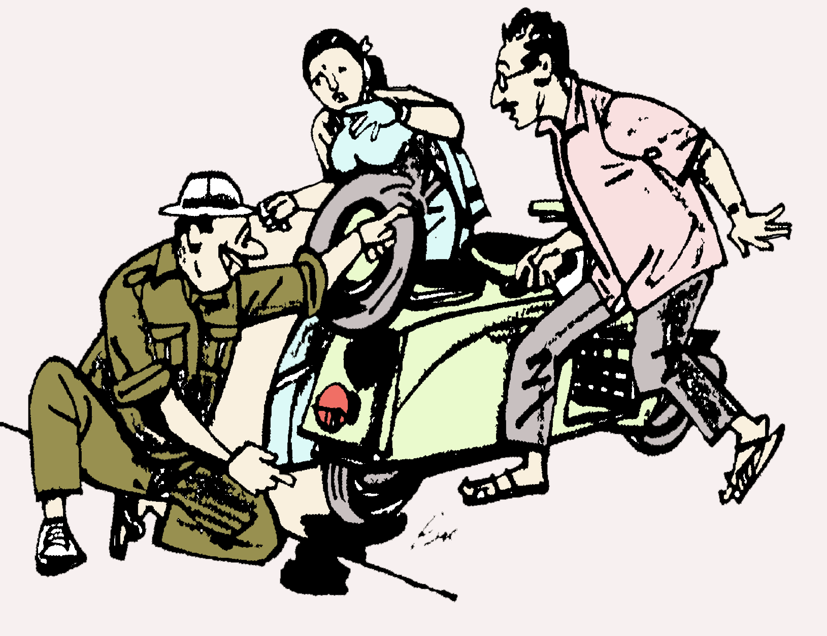 “ స్కూటర్ మార్జినులోనే ఉంది.కాని స్కూటరు నీడ గీతదాటి రోడ్డు మీదికొచ్చింది.రూలు ప్రకారం స్కూటరుకు సంబందించినడి ఏది గీత దాటి బయటికి రాకూడదు.” అన్నాడు పోలీసు .