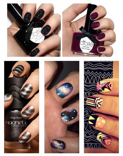 That typical single color nail polish trend is too old to flaunt..even the nail art trends keep changing with changing fashion trends and seasons..it all started with a coat of transparent glitter on any color, then the french manicure craziness, later came the polka dots and tiny flowers on a dark color, and the diagonal stripes on a dark color with metallic shades...now is the embellishment trend....using stones and such is also old, these are the days of using small bows, metal chain strips and stencils of cupcakes and monuments etc. the nail art crafts industry is stretching wide too, there are oh-so many unimaginable products out there at every Nail Spa.