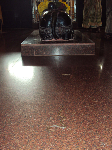 దృశ్యాన్ని దైవలీలగా భావించిన కొందరు పెద్దలు ఒక వస్త్రం తెచ్చి పామును దానిమీదికి ఎక్కించారు. నాలుగు చెంగులూ కలిపి పట్టుకుని శివలింగం వద్దకు తీసికెళ్ళారు.