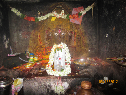 ఈ శివాలయాలన్నీ పై వరసలో వుంటే కింద ఆలయంలో త్రిముఖ దుర్గ, ముందు శివలింగం పూజలందుకుంటున్నాయి. ఈ దుర్గ కుడివైపు ముఖం మహాకాళి..నోట్లోంచి జ్వాల వస్తూ వుంటుంది. మధ్యన మహలక్ష్మి, ప్రసన్నవదన. ఎడమవైపు మహా సరస్వతీదేవి. ఎక్కడా లేనట్లు ఇక్కడ సరస్వతీదేవి అద్దం చూసుకుంటూ వుంటుంది. కారణం అడిగితే పూజారిగారు తన భీకరమైన స్వరూపం భక్తులు చూస్తే తట్టుకోలేరని అలా అద్దంద్వారా చూస్తే కొంత తీవ్రత తగ్గుతుందని చెప్పారు. నా కోతి బుధ్ధి అంగీకరించలేదు. నాకు తెలిసి సరస్వతీదేవి సౌందర్యవతి, జ్ఞాన ప్రదాత.. తను ఉగ్ర రూపిణి కాదు అంటే…అయితే ఆవిడ తన అలంకరణ చూసుకుంటోంది అనుకోండి అన్నారు.