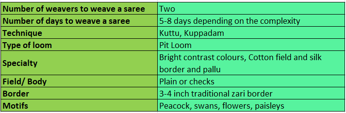 Usually, Gadwal sarees are woven as fine cotton sarees with either mulberry or tussar silk pallu and border. On rare occasions, pure-silk sarees are woven too. The speciality of the Gadwal sarees is their bright and contrasting colours, Kotakomma (Temple) technique, and the kuttu or Kuppadam or Tippadam (the interlocked weft) technique.