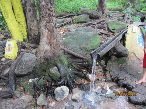 ఆలయం సమీపంలోనే వున్న ఈ జలపాతంలోని నీరు అద్భుత ఔషధ గుణాలుగలదనీ, దీనిని సేవిస్తే అనేక రుగ్మతలు తొలగిపోతోయనీ విశ్వసిస్తారు. కారణం ఈ నీరు అనేక ఔషధ మొక్కలను ఒరుసుకుంటూ ప్రవహిస్తుంది. జలపాతం అన్నానని ఎత్తుమీదనుంచి దూకే ప్రవాహాన్ని ఊహించుకోకండి. అత సన్నటి ధార మాత్రమే. దీనిని అనేకమంది సీసాలలో తీసుకెళ్లి (కావాల్సినవాళ్ళు సీసాలు తమతో తీసుకెళ్ళాలి..అక్కడ దొరకవు) రోజూ ఔషధంలాగా సేవిస్తారు.