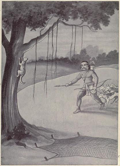 ఒకానొక అడవిలో ఓ మర్రిచెట్టు కింద ఫలితుడు అనే ఎలుక జీవిస్తోంది. అదే చెట్టు మీద రోజసుడు అనే పిల్లి కాపురం చేస్తోంది. ఒక వేటగాడు రోజూ రాత్రి ఆ చెట్టు దగ్గరకు వచ్చి, అక్కడ ఓ వలను పరచి వెళ్లేవాడు. రాత్రివేళ అందులో ఏవో ఒక జంతువులు చిక్కుకుంటాయి కాబట్టి, ఉదయమే వచ్చి వాటిని చేజిక్కించుకుని చక్కగా పోయేవాడు. ఒక రోజు అనుకోకుండా ఈ రోజసుడు అనే పిల్లి పోయి పోయి ఆ వలలో చిక్కుకుపోయింది. పిల్లి వలలో పడింది కాబట్టి ఎలుక దానిచుట్టూ నిర్భయంగా తిరుగుతూ ఆహారం కోసం వెతకసాగింది.
