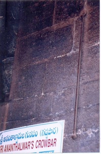 ఆగ్రహించిన అనంతాళ్వారులు కోపంతో, చేతిలో ఉన్న గునపాన్ని బాలుని మీదకి విసురుతాడు. అది వెళ్ళి బాలుని గడ్డానికి తగులుతుంది. ఆ బాలుడు అక్కడ నుంచి వెళ్ళిపోతే, అనంతాళ్వారులు మళ్ళీ బావి తవ్వే పనిలో నిమగ్నం అవుతారు. సాయంత్రం చక్కగా పూల మాలలు అల్లి బుట్టలో పెట్టుకొని శ్రీవారి ఆలయానికి వెళ్తాడు అనంతాళ్వార్. అక్కడ శ్రీనివాసుని గడ్డానికి దెబ్బ తగిలి రక్తం రావటం చూసిని అనంతాళ్వారులు, అయ్యో ... నేను గునపం విసిరింది ఎవరిమీదకో కాదు, సాక్షాత్తు శ్రీనివాసుడే బావి తవ్వటంలో సహాయం చెయ్యటానికి వచ్చాడని గ్రహిస్తాడు. స్వామివారి గడ్డం పై పచ్చకర్పూరం అద్దుతాడు. అప్పటినుంచి స్వామివారి గడ్డం పై రోజూ పచ్చకర్పూరం అద్దుతారు. ఇప్పటికీ మనం అనంతాళ్వారులు స్వామివారి మీద విసిరిన గునపాన్ని మహద్వారం దాటిన తర్వాత కుడి వైపు గోడకు వెళ్ళడుతూ ఉండటం చూడవచ్చు. శ్రీ అనంతాళ్వార్ బృందావనం శ్రీవారి ఆలయం వెనకవైపు ఉంటుంది. మనం అనంతాళ్వార్ బృందావనం దర్శించవచ్చు. శ్రీవారి ఉత్సవ మూర్తి అయిన మలయప్పస్వామి సంవత్సరానికి ఒకసారి శ్రీ అనంతాళ్వార్ బృందావనం కి వెళ్తారు