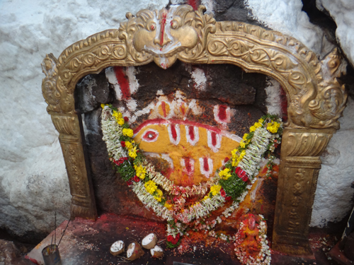 స్వామి విగ్రహం ఫోటో చూడండి. దానికి ముందు వున్న బండరాయి అప్పుడు పూర్తిగా స్వామిని కప్పేస్తూ వుండేదిట. వాళ్ళు ఆ రెండు రాళ్ళ మధ్య వున్న సందులోంచి స్వామి దర్శనం చేసుకునేవారుట. అలాగే అభిషేకం చేసేవారుట. స్వామి విగ్రహానికి కేశాలు వున్నాయని స్ధల పురాణంలో వున్నది. దాని గురించి అడిగితే నిజమని, తాము ప్రత్యక్షంగా చూశామని, చేతికి వచ్చేవని చెప్పారు. ఇప్పుడు ఏమీ లేవు.