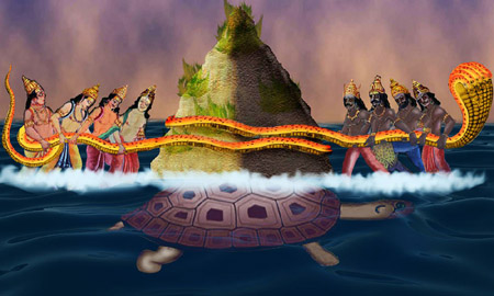 అమృతం కోసం దేవదానవులిద్దరూ క్షీరసాగరాన్ని మథించిన ఘట్టం రామాయణ,భారతాల్లోనే కాకుండా పురాణాల్లో కూడా ప్రస్తావనకు వస్తుంది. అలా సాగరమథనం ద్వారా వచ్చిన అమృతాన్ని పంచుకోవలన్నది దేవదానవుల నియమం. అందుకోసం నాగరాజైన వాసుకిని తాడుగానూ, మందర పర్వతాన్ని కవ్వంగానూ ఉపయోగించాలనుకున్నారు దేవదానవులు. ఈనాటి బిహార్లోని భగల్పూర్ హైవేకి దగ్గరలో ఉన్న ఎత్తైన గ్రానైటు కొండే పురాణాల్లో పేర్కొన్న మందర పర్వతమని కొందరి నమ్మకం. దానికి తగినట్లుగానే ఆ కొండ శిఖరం కవ్వం ఆకారంలో ఉంటుంది. ఇక సాగరమథనం కోసం మందర పర్వతానికి దన్నుగా కూర్మావతారం(తాబేలు) వెలసింది. తాబేలుది ఒక చిత్రమైన ప్రవృత్తి. తనకి ఏదైనా హాని జరుగుతుందని తెలిసినప్పుడు, లోపలికి ముడుచుకుపోతుంది. బాహ్య ప్రవృత్తిగా ఉన్న ఇంద్రియాలన్నింటినీ విరమించుకోగలగడం ధ్యానికి ఉండే ఉన్నతమైన లక్షణం అని యోగం చెబుతోంది. సర్పమేమో (వాసుకి) కుండలినిని సూచిస్తుంది. మనిషిలో ఉండే మంచి చెడులే దేవదానవులు! మనిషి అంతర్మఖుడై, తనలో నిద్రాణంగా ఉన్న ఆధ్మాత్మిక శక్తులను మేల్కొల్పడానికి నిత్యం చేసే ప్రయత్నమే సాగరమథనం.