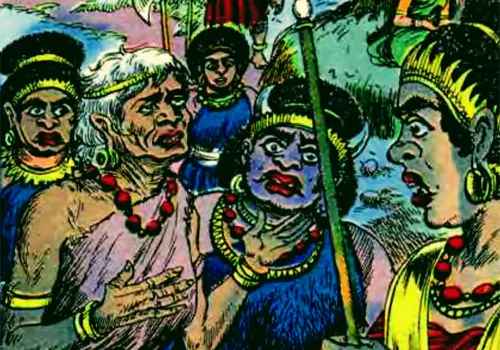 ఇక్కడ లంకా పట్టణంలో రావణాసురుడు మాత్రం గాడిదలు పూన్చిన రథం ఎక్కి, ఎర్రటి వస్త్రములు ధరించి, నూనె తాగుతూ ఉన్నాడు. ఆ రథం దక్షిణ దిక్కుగా వెళ్ళిపోయింది. కొంతదూరం వెళ్ళాక ఆ రథం నుండి దక్షిణ దిక్కుకి తల ఉండేలా కింద పడిపోయాడు. తరువాత పైకి లేచి మెడలో గన్నేరు పూల మాలలు వేసుకొని పిచ్చి పిచ్చిగా అరుస్తూ, నాట్యం చేస్తూ పరిగెత్తి ఒక కంపుకొట్టే మురికి గుంటలో పడిపోయాడు. అప్పుడు వికటాట్టహాసం చేస్తూ, ఎర్రటి వస్త్రములు ధరించి, బోడి గుండుతో ఉన్న ఒక స్త్రీ పాశం వేసి రావణుడిని బయటకి లాగింది. అప్పుడామె రావణుడిని పశువుని తీసుకెళ్ళినట్టు దక్షిణ దిక్కుకి తీసుకువెళ్ళింది. ఆవిడ వెనకాల చప్పట్లు కొడుతూ, నాట్యం చేస్తూ రావణుడు వెళ్ళిపోయాడు. వాళ్ళ వెనకాల కుంభకర్ణుడు, ఇంద్రజిత్ మొదలైనవారు ఒంటె, మొసలి మొదలైన వాహనములను ఎక్కి దక్షిణ దిక్కుకి వెళ్ళిపోయారు.
