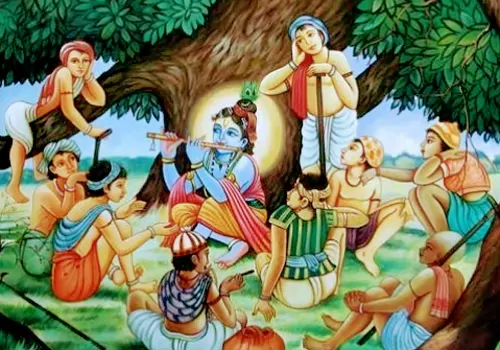 వాళ్ళకి బృందావనం చాలా బాగా నచ్చింది. అక్కడ గోవర్ధన గిరి వుంది. చూడచక్కగా వుంది. పచ్చని కొండ. పశువుల మేతకు కొరత లేదు. తాగినంత నీరు, తియ్యగా అమృతంలా వుంది. పరవళ్ళు తొక్కుతున్న యమునను చూస్తూనే గొల్ల భామలంతా ఆనందంగా చిందులు వేస్తూ ఆటలాడుతూ పాటలు పాడారు.. చెట్లనీడన సేదతీరుతూ పశువులన్నీ ఒకేసారి 'అంబా' అని సంబరంగా అరిచాయి. కృష్ణయ్య, బలరాముడు సహవాసగాళ్ళతో కలిసి తెగ ఆటలాడారు.