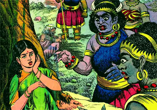 రావణుడు సీతను దండించమని రాక్షస స్త్రీలతో చెప్పి పోగానే రాక్షస స్త్రీలు అందరూ సీతను చంపి పంచుకుని తినడానికి శరీరభాగాలను వంతులు వేసుకున్నారు. అప్పుడు సీత బాధతో శింశుపా వృక్షం మరొకవైపుకు వెళ్లి కూర్చుంది. అప్పుడే త్రిజట అనే రాక్షసి లేచి అక్కడున్న మిగిలిన రాక్షస స్త్రీలతో తనకు వచ్చిన కల గురించి వివరంగా చెబుతూ కలలో రాముడు సీతను తీసుకెళ్తున్నట్టు, రావణాసుడు గాడిద మీద ఊరేగుతున్నట్టు కల వచ్చిందని చెప్పింది. కానీ సీత మాత్రం నిరాశకు లోనయ్యింది.