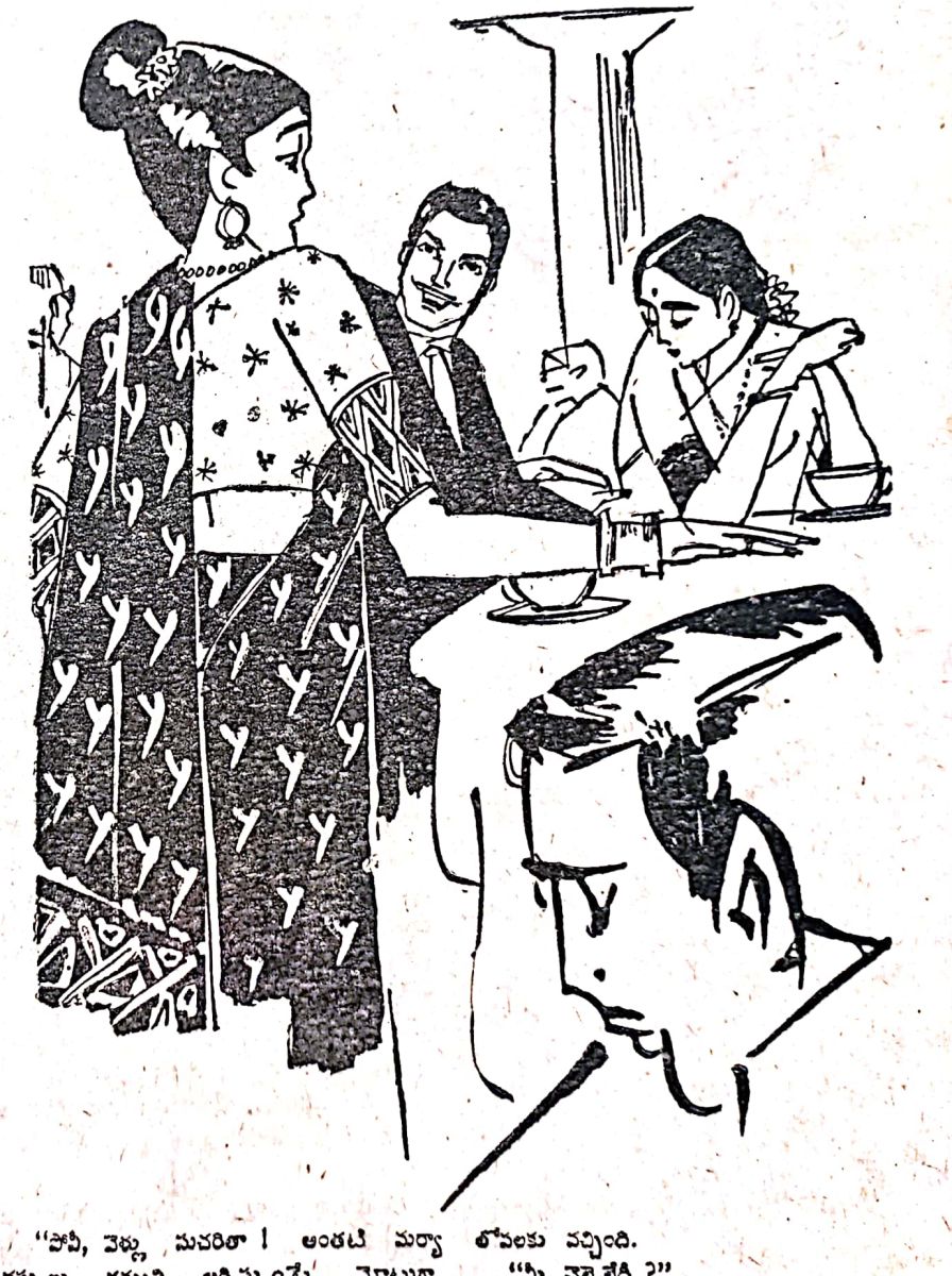 ఆమె వంక కళ్ళప్ప జెప్పి చూస్తూ నిలబడి పోయాను. నా సంచలనాన్ని అర్ధంచేసికోన్నదా అన్నట్లు ఆమె సిగ్గుతో కూడిన గర్వంతో నవ్వింది. ఆ నవ్వులో నాకు కోటి మెరుపులు కనిపించాయి. ఆమె కూర్చున్న బల్ల దగ్గిర ఎవరూ లేరు. ఒక్కర్తే కూర్చుంది. అటు నడువ బోయాను. అంతలో మనోరంజని వచ్చింది.