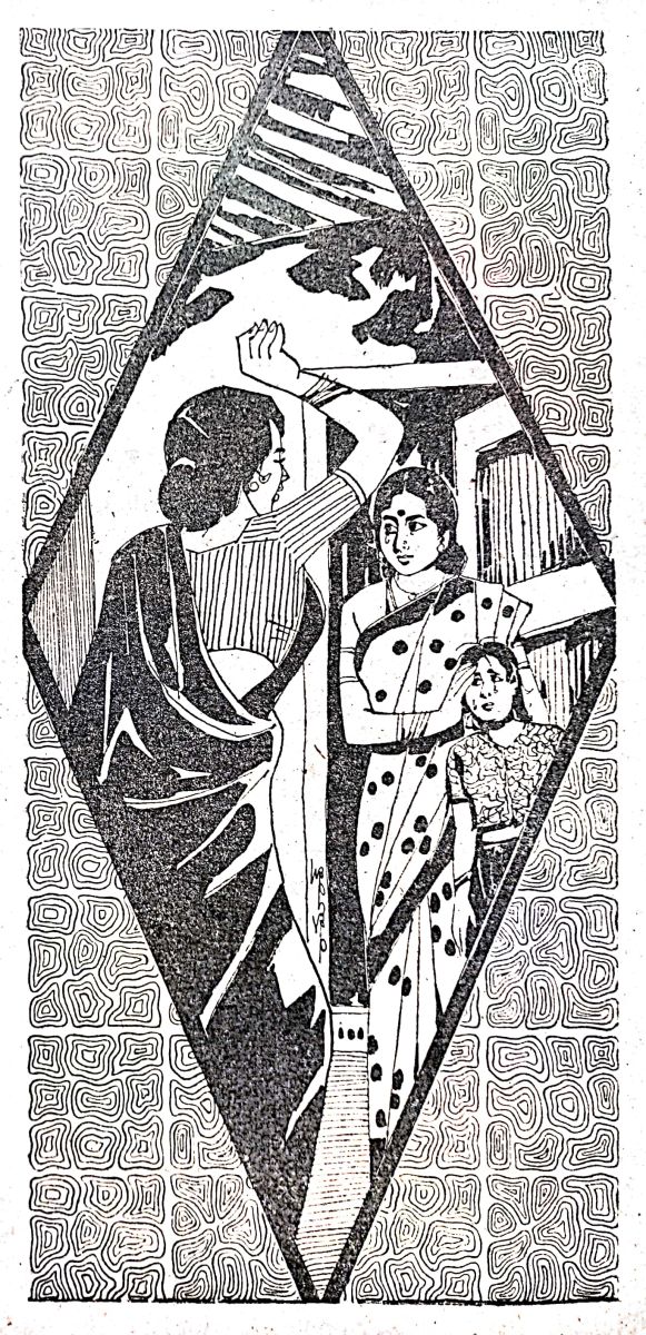 కోపంతో ముందుకొచ్చింది రుక్మిణి-విసురుగా చెయ్యెత్తింది - తన ఉడుకు చల్లారాలంటే ఎవరినో బాధాలి -బాల నెందుకు కొట్టటం? మాధవి వీపుమీద దభీ దభీమని దెబ్బలు పడుతున్నాయి-'అమ్మో! బాబో!' అని అరుస్తూ తప్పించుకోవటానికి ప్రయత్నిస్తోంది మాధవి-మాధవి అలా తప్పించుకోవటానికి ప్రయత్నించిన కొద్దీ మరింత కసిగా బాదుతోంది రుక్మిణి-సరిగా ఆ సమయంలో వచ్చింది పరమేశ్వరి-మెరుపులా మాధవికి అడ్డు నిల్చుని మాధవి మీద పడాల్సిన దెబ్బ తాను అందుకుంది-తెల్లబోతూ క్షణం ఆగింది రుక్మిణి-