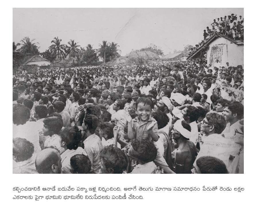 కల్పించడానికి ఆనాడే ఐదు వేల పక్కా ఇళ్ళ నిర్మించింది. అలాగే తెలుగు మాగాణ సమారాధనం పేరుతొ రెండు లక్షల ఎకరాలకు పైగా భూమిని భూమి లేని నిరుపేదలకు పంపిణీ చేసింది.