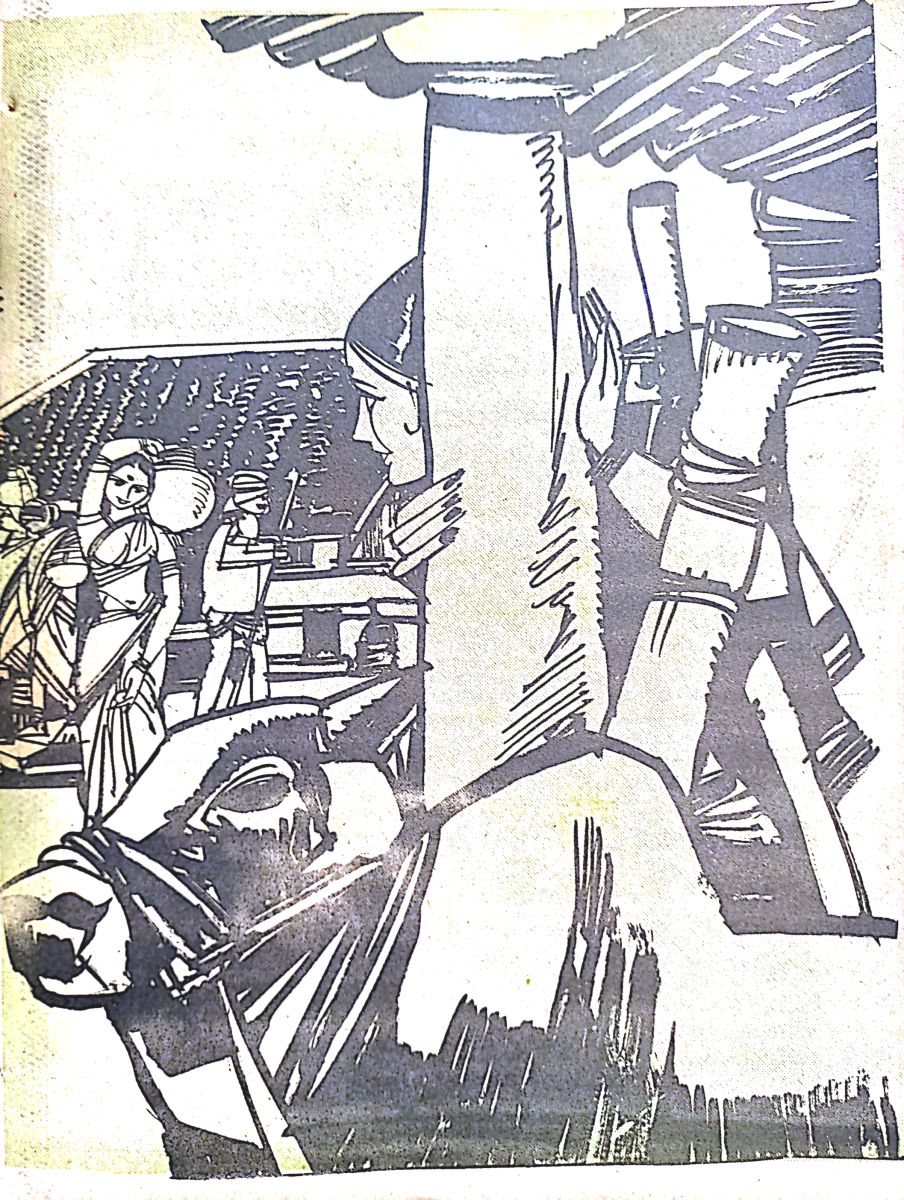 ఆ వాని పెళ్ళా మొచ్చేసింది. చింపిరి తలలో వేళ్ళు దూర్చి గోక్కుంటుంది. రవిక ఒక వైపు జబ్బ దగ్గర చిరిగి, భుజకీర్తుల మల్లె వేలాడుతుంది. నీలకంఠడు హాలాహాలాన్నీ అంగిట్లో నిలుపుకున్నట్లు తాంబూలం నోట్లో దాచుకుంది. ఆ గుప్త దనాన్ని చూసుకుని సంతోషంతో ఆ బుగ్గ ఉబ్బిపోయింది. నడుము నించీ మోకాళ్ళ దాకా చుట్టుకుని, ఇంకా పాదాల దాకా ఆ శరీరాన్ని కప్పడ మెట్లాగో తేలియక, అటుకులు కలుపుకున్నా చేతకాక ఆ చీరె అక్కడే ఆగిపోయింది!