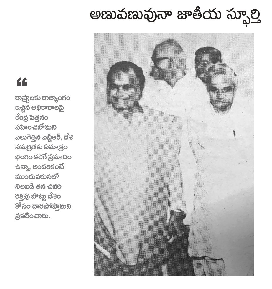 (రాష్ట్రాలకు రాజ్యాంగం ఇచ్చిన అధికారాలపై కేంద్రం పెత్తనం సహించబోమని ఎలుగెత్తిన ఎన్టీఆర్ , దేశ సమగ్రతకు ఏమాత్రం భంగం కలిగే ప్రమాదం ఉన్నా, అందరి కంటే ముందు వరుసలో నిలబడి తన చివరి రక్తపు బొట్టు దేశం కోసం ధారపోస్తామని ప్రకటించారు )
