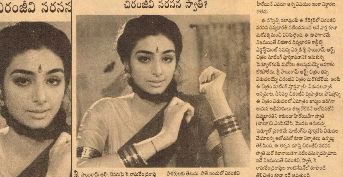 'రౌడీ అల్లుడు'లో శోభన, దివ్యభారతి హీరోయిన్స్ గా చేసిన విషయం తెలిసిందే. శోభన ని ఒక హీరోయిన్ గా ఫిక్స్ చేసినప్పుడే మరో హీరోయిన్ గా దివ్య భారతిని అనుకున్నారు. కాకపోతే ఆమె బిజీగా ఉంటే మెగాస్టార్ నుంచి వచ్చే సినిమా మరొకటి లేదు కాబట్టి, మూవీ లేట్ అయితే ఫ్యాన్స్ ఒప్పుకోరు. కాబట్టి దివ్యభారతి ప్లేస్ లో మరో నాయిక 'స్వాతి'(Swathi)ని సెకండ్ హీరోయిన్ గా ఫిక్స్ చేసి షూటింగ్ కి వెళ్లాలని 'రౌడీ అల్లుడు' టీం అనుకుంది. సదరు పేపర్ కటింగ్ లో ఈ విషయం మొత్తం స్పష్టంగా ఉంది. దీంతో సదరు వార్తని చూసి ఫ్యాన్స్ తో మూవీ లవర్స్ మురిసిపోతున్నారు. మరి ఈ రోజు రౌడీ అల్లుడు చూడటం పక్కా. ఇక స్వాతి ఎవరో కాదు టాప్ హీరోయిన్ గా తన సత్తా చాటిన టబు(Tabu).