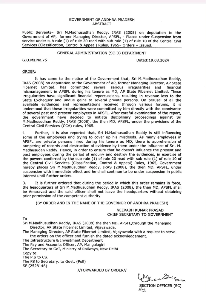 ఫైబర్ నెట్ మాజీ ఎండీ మధుసూదన్ సస్పెన్షన్!