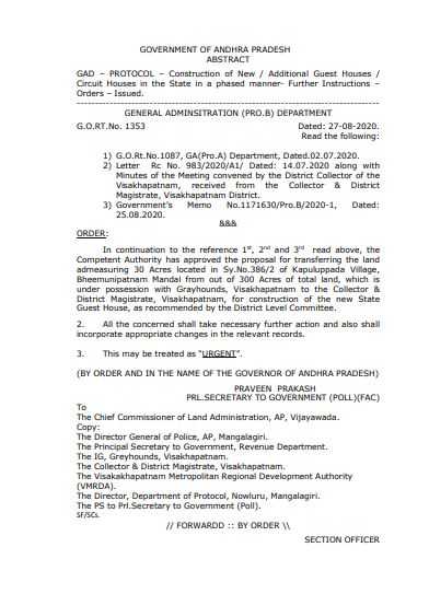 రాష్ట్ర ప్రభుత్వం సాధారణ పరిపాల శాఖ ద్వారా నిన్న జీవో నెంబర్ 1353 ని విడుదల చేసింది. దీనీలో, విశాఖపట్నం దగ్గరలోని భీమునిపట్నం మండలంలో వున్న గ్రేహౌండ్స్ కు సంబంధించిన సర్వే నెంబర్ 386/2 లోని 300 ఎకరాలలో 30 ఎకరాలు విశాఖపట్నం జిల్లా కల్లెక్టర్ పేరుపై స్టేట్ గెస్ట్ హౌస్ కట్టడానికి ట్రాన్స్ఫర్ చెయ్యాలని ఆదేశాలు జారీ చేయడం జరిగింది.