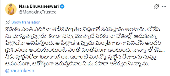ఆంధ్రప్రదేశ్ మంత్రి నారా లోకేశ్ పుట్టినరోజు సందర్భంగా ఆయన తల్లి నారా భువనేశ్వరి తన కుమారుడికి జన్మదిన శభాకాంక్షలు తెలిపారు. సామాజిక మాధ్యమ వేదిక ఎక్స్ లో తనయుడికి జన్మదిశ శుభాకాంక్షలు తెలియజేస్తూ భవనేశ్వరి పోస్ట్ చేసిన సందేశం భావోద్వేగ పూరితంగా ఉండి నెటిజనులను విశేషంగా ఆకట్టుకుంది.