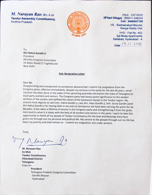 ఇన్నాళ్లు అభ్యర్థుల జాబితా ఎప్పుడు వస్తుందా అని ఎదురు చూసిన నాయకులు ఇప్పుడు జాబితా ప్రకటనతో తిరుగుబాటుకు సిద్ధమయ్యారు.తాజాగా తాండూరు మాజీ ఎమ్మెల్యే, కాంగ్రెస్ పార్టీ సీనియర్ నేత ఎం. నారాయణరావు కాంగ్రెస్ పార్టీకి రాజీనామా చేశారు.తాండూరు టికెట్ పైలట్ రోహిత్ రెడ్డికి కేటాయించటంతో ఆయన అసంతృప్తికి లోనయ్యారు.దీనికి నిరసనగా కాంగ్రెస్ పార్టీకి రాజీనామా చేస్తున్నట్టు జాతీయ అధ్యక్షుడు రాహుల్ గాంధీకి లేఖరాశారు. తాండూరు నియోజకవర్గంలో తాను బడుగు, బలహీన వర్గాల అభివృద్ధికి, పార్టీ బలోపేతానికి ఎంతో కృషి చేశానని,స్వర్గీయ ఇందిరాగాంధీ, రాజీవ్ గాంధీతో పాటు సోనియా గాంధీతో, మీతో కలిసి పనిచేసిన అనుభవం ఉందని లేఖలో పేర్కొన్నారు.ఆరు దశాబ్దాలుగా పార్టీ అభివృద్ధికి తమ కుటుంబం ఎంతో కృషి చేసిందని పేర్కొన్నారు.