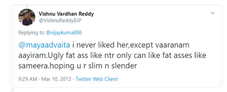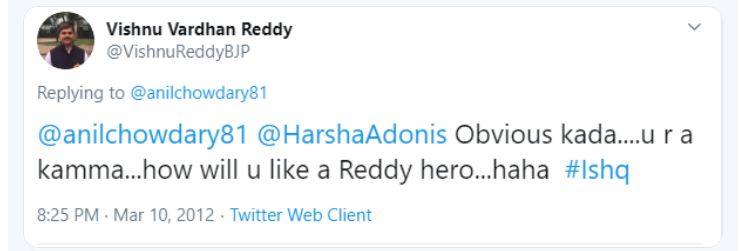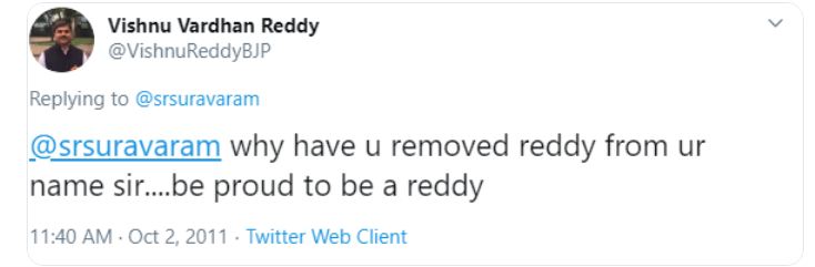 దాదాపు పదేళ్ల క్రితం.. విష్ణువర్ధన్ రెడ్డి పెద్దగా ఎవ్వరికీ తెలీదు. అయితే అప్పట్లో ఆయన చేసిన ట్వీట్లు చూస్తే తెలియకపోవడమే మంచిది అనుకుంటారు. ఆయన ట్వీట్లు చూస్తే ఆయనకు ఎంత కులపిచ్చి ఉందో అర్ధమవుతుంది. ఆయన కులానికి చెందిన వారిని పేరుపేరునా పొగుడుతూ ట్వీట్ చేయడం. మిగతా కులాల్ని కించపరచడం. అంతేకాదు ఆడవారి అందాల గురించి సంస్కారం లేకుండా మాట్లాడటం. ఇలా ఆయన పదేళ్ల క్రితం చేసిన ఏ ట్వీట్ చూసినా చండాలమే. ఛీ ఛీ ఈయన ఓ జాతీయ పార్టీ నాయకుడా అనుకునేలా ఉన్నాయి ఆయన ట్వీట్స్. రాజకీయ నాయకుడు కులాలు, మతాలతో సంబంధం లేకుండా.. అందర్నీ కలుపుకొని పోతూ ప్రజలకి మంచి చేయాలి. కానీ ఈయన నరనరాల్లో కులపిచ్చి నింపుకొని ప్రజాసేవ అర్థాన్నే మార్చేశారు. దీంతో ప్రస్తుతం విష్ణుపై సోషల్ మీడియా వేదికగా విమర్శల వర్షం కురుస్తోంది.