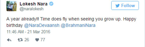 ఏపీ ముఖ్యమంత్రి చంద్రబాబు నాయుడి మనవడు టిడిపి జాతీయ ప్రధాన కార్యదర్శి నారా లోకేష్, బ్రాహ్మిణిల కొడుకు దేవాన్ష్ పుట్టినరోజు సందర్బంగా చంద్రబాబు తిరుమల తిరుపతి దేవస్థానానికి రూ.20 లక్షల విరాళం ఇచ్చారు. అంతేకాదు నారా లోకేశ్ దేవాన్ష్ పుట్టిన రోజు సందర్భంగా తన ట్విట్టర్లో.. దేవాన్ష్కు ఏడాది పూర్తయిందని, నిన్ను చూస్తుంటే టైం అలా గడిచిపోతోందని, హ్యాపీ బర్త్ డే అంటూ ట్వీట్ చేశాడు.