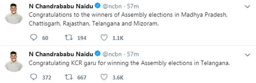 టీఆర్ఎస్ ని గద్దె దించడమే లక్ష్యంగా కాంగ్రెస్, టీడీపీ పార్టీలు ప్రజకూటమితో దగ్గరయ్యాయి. దీంతో ప్రచారంలో టీఆర్ఎస్ నేతలు చంద్రబాబు మీద తీవ్ర విమర్శలు గుప్పించారు. చంద్రబాబు కూడా టీఆర్ఎస్ కి వ్యతిరేకంగా ప్రచారం చేశారు. అయితే ఇదంతా ఎన్నికలు వరకే అని చంద్రబాబు రుజువు చేశారు. తెలంగాణ అసెంబ్లీ ఎన్నికల్లో విజయం సాధించిన కేసీఆర్ గారికి శుభాకాంక్షలు’ అంటూ చంద్రబాబు ట్వీట్ చేశారు. అలాగే మధ్యప్రదేశ్, రాజస్థాన్, ఛత్తీస్గఢ్, మిజోరం రాష్ట్రాల్లో విజయం సాధించిన అభ్యర్థులకు కూడా చంద్రబాబు శుభాకాంక్షలు తెలిపారు.