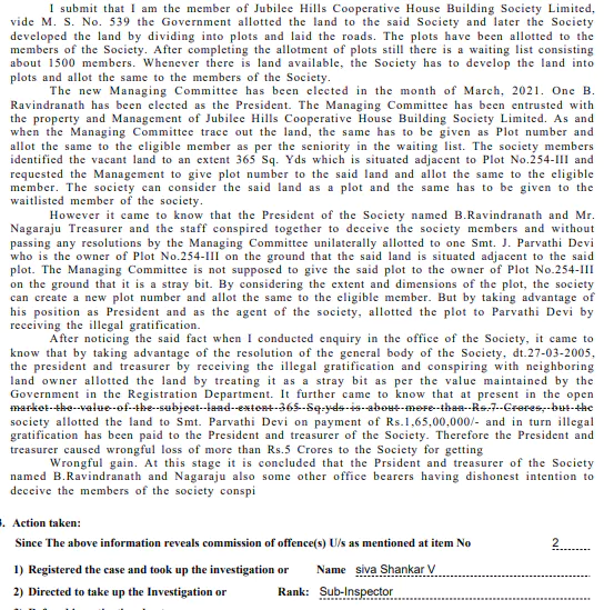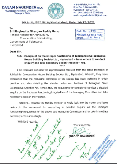 నిజానికి ఈ సొసైటీలో అక్రమాలు, అవకతవకలు జరుగుతున్నాయని , సొసైటీ సభ్యులు చేసిన ఫిర్యాదు మేరకు స్థానిక అధికార పార్టీ ఎమ్మెల్యే దానం నాగేందర్, ఎప్పుడో సంవత్సరం క్రితమే ప్రభుత్వానికి ఫిర్యాదు చేశారు. మంత్రి గారికి వినతి పత్రం అందజేశారు.