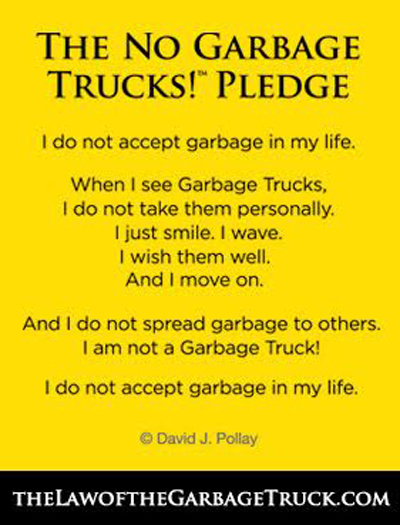 He explained that many people are like garbage trucks. They run around full of garbage, full of frustration, full of anger, and full of disappointment. As their garbage piles up, they need a place to dump it, and sometimes they’ll dump it on you. Don’t take it personally. Just smile, wave, wish them well, and move on. Don’t take their garbage and spread it to other people at work, at home, or on the streets.The bottom line is that successful people do not let garbage trucks take over their day.