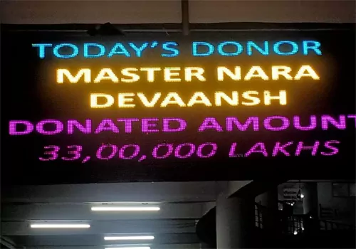 అయితే ప్రతి ఏటా దేవాన్ష్ పుట్టిన రోజు సందర్భంగా ఒక రోజు.. అన్నప్రసాదం కోసం విరాళం ఇవ్వడం నారా ఫ్యామిలీకి ఆనవాయితీగా వస్తున్న సంగతి తెలిసిందే. నారా దేవాన్ష్ పుట్టిన రోజు సందర్భంగా ఈ రోజు నిత్యన్నదానం కోసం విరాళం ఇవ్వడంతో.. మంగళవారం తిరుమలలోని శ్రీవారి ఆలయ పరిసర ప్రాంతాలతోపాటు తరిగొండ వెంగమాంబ నిత్యన్న దానం కేంద్రం వద్ద ఏర్పాటు చేసిన డిస్ ప్లే బోర్డుల్లో నారా దేవాన్ష్ పేరు ప్రదర్శిస్తున్నారు.