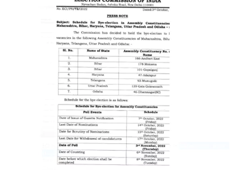 తెలంగాణే కాక మొత్తం దేశం అత్యంత ఆసక్తిగా ఎదురు చూస్తున్న మునుగోడు ఉప ఎన్నిక షెడ్యూల్ విడుదలైంది. నవంబర్ 3న మునుగోడు ఉప ఎన్నిక జరగ నుంచి. ఈ మేరకు కేంద్ర ఎన్నికల సంఘం షెడ్యూల్ విడుదల చేసింది. దేశ వ్యాప్తంగా ఏడు అసెంబ్లీ స్ధానాలకు కేంద్ర ఎన్నికల సంఘం షెడ్యూల్ విడుదల చేసింది. మహారాష్ట్ర, ఉత్తర ప్రదేశ్, బీహార్, హర్యానా, ఒడిశా, తెలంగాణ రాష్ట్రాలలో మొత్తం ఏడు అసెంబ్లీ స్థానాలకు ఉప ఎన్నికలు జరగనున్నాయి. కేంద్ర ఎన్నికల సంఘం విడుదల చేసిన షెడ్యూల్ మేరకు ఈ నెల 7న నోటిఫికేషన్ వెలువడ నుంది. ఈ నెల 14 వరకూ నామినేషన్ల స్వీకరణ ఉంటుంది. 15న నామినేషన్ల పరిశీలన, నామినేషన్ల ఉప సంహరణకు తుది గడువు ఈ నెల 17.