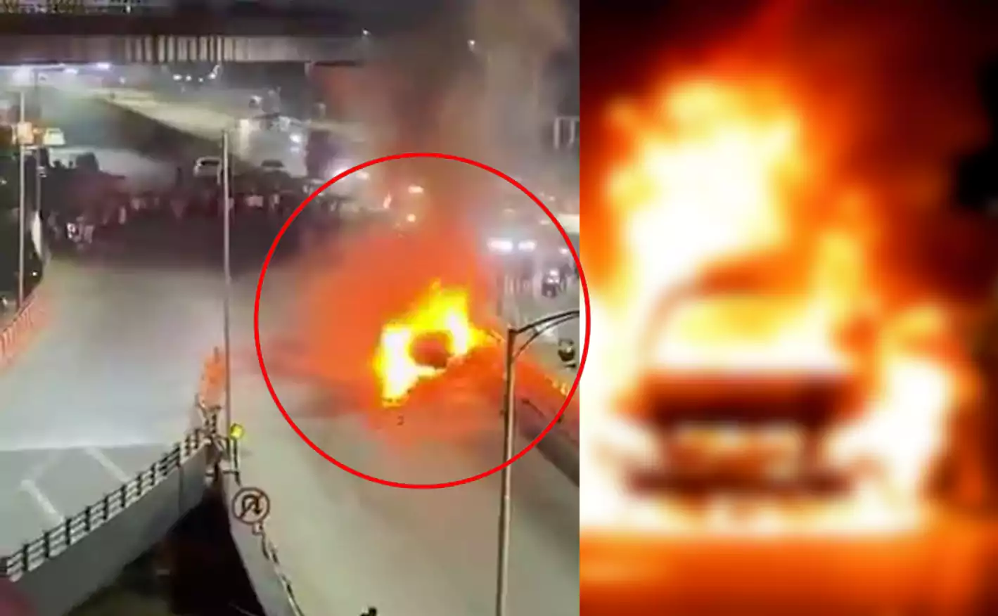 దీంతో వాహనదారులు తీవ్ర ఇబ్బందులను ఎదుర్కొ న్నారు. సమాచారం అందుకున్న అగ్నిమాపక సిబ్బంది ఘటనాస్థలానికి చేరుకుని మంటలను అదుపులోకి తెచ్చారు. ఈ ప్రమాదం కారణంగా కొంతసేపు ట్రాఫిక్కు అంతరాయం కలిగింది. పోలీసులు కేసు నమోదు చేసి దర్యాప్తు చేపట్టారు. అతివేగమే ప్రమాదానికి కారణమై ఉండొచ్చునని పోలీసులు ప్రాథమికంగా భావిస్తు న్నారు.