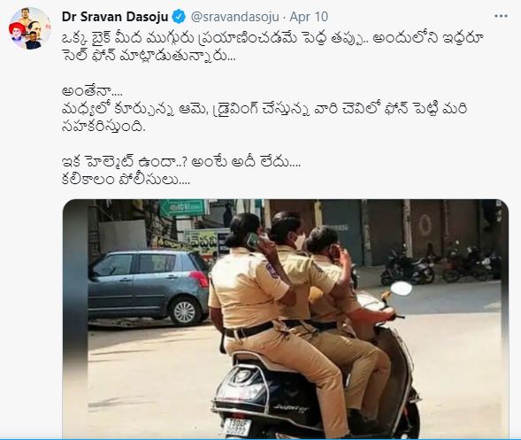 ద్విచక్ర వాహనంపై ముగ్గురు మహిళా పోలీసులు వెళుతూ... ఫోన్ మాట్లాడుతున్న ఫొటోను దాసోజు శ్రవణ్ ట్వీట్ చేయగా అది వైరల్గా మారింది. తన ట్వీట్కు రాష్ట్ర డీజీపీని ట్యాగ్ చేశారు దాసోజు. ఈ ట్వీట్ ప్రస్తుతం నెట్టింట వైరల్గా మారింది. పెద్ద ఎత్తున నెటిజన్లు రీట్వీట్లు చేస్తూ... ట్రాఫిక్ పోలీస్ సిబ్బంది తీరును విమర్శిస్తున్నారు.