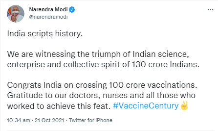 పలువురు కేంద్రమంత్రులు, ఇతర రాజకీయ ప్రముఖులు కూడా ట్విటర్ వేదికగా 100 కోట్ల మార్క్పై అభిందనలు తెలియజేశారు. ‘‘టీకా పంపిణీలో అద్భుతమైన లక్ష్యాన్ని సాధించిన సందర్భంగా భారత ప్రజలకు అభినందనలు. ఈ చరిత్రాత్మక రికార్డును చేరుకోవడంలో కృషి చేసిన వైద్యారోగ్య సిబ్బంది, శాస్త్రవేత్తలు, టీకా తయారీదారులు, కేంద్ర, రాష్ట్ర ప్రభుత్వాలకు ప్రత్యేక అభినందనలు. ఇంకా వ్యాక్సిన్ తీసుకోనివారు భయాలన్నీ పక్కనబెట్టి టీకా వేయించుకోవాలని కోరుకుంటున్నా. మనమంతా కలిసి కరోనాను ఓడిద్దాం’’ అని ఉపరాష్ట్రపతి వెంకయ్యనాయుడు పిలుపిచ్చారు.
