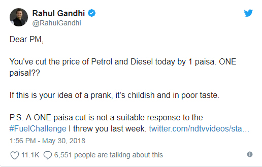 ఇదిలా ఉండగా.. ఇక ఈ ఒక్కపైసా తగ్గింపుపై కాంగ్రెస్ పార్టీ అధ్యక్షుడు రాహుల్ గాంధీ స్పందించి మోడీపై సెటైర్లు వేశారు. మీరేమైనా ప్రజలతో పరాచకాలు ఆడుతున్నారా.. ఒక్క పైసా తగ్గించడం ఏంటీ... మీరు చేసింది పిల్ల చేష్టల్లా ఉన్నాయి అని మండిపడ్డారు. అంతేకాదు..తాను చేసిన ఫ్యూయల్ ఛాలెంజ్ పై కూడా స్పందించి.. నేను ఫ్యూయల్ ఛాలెంజ్ చేశాను కదా అని... దానికి ఈ రకంగా సమాధానం చెబుతారా అని ప్రశ్నించారు. మరి నిజంగానే పరాచకాలు కాకపోతే.. తగ్గించకపోతే అసలు తగ్గించకుండా ఉండాలి అంతేకానీ... ఒక్క పైసా తగ్గించి ప్రజలతో పరాచికాలు ఆడటం ఏంటీ..!