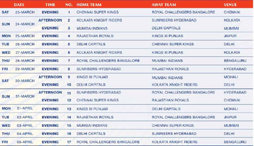 ఇండియన్ ప్రీమియర్ లీగ్ 2019 సీజన్ తొలి రెండు వారాల షెడ్యూలును బీసీసీఐ విడుదల చేసింది. లోక్సభ ఎన్నికల నేపథ్యంలో తొలి రెండు వారాల షెడ్యూల్ని మాత్రమే విడుదల చేస్తున్నామని, లోక్సభ ఎన్నికల షెడ్యూల్ను అనుసరించి తదుపరి షెడ్యూల్ని త్వరలో ప్రకటిస్తామని పేర్కొంది. తొలి మ్యాచ్ లో డిఫెండింగ్ ఛాంపియన్స్ చెన్నై సూపర్ కింగ్స్, రాయల్ ఛాలెంజర్స్ బెంగళూరు జట్లు తలపడనున్నాయి. మార్చి 23 చెన్నై వేదికగా ఈ మ్యాచ్ జరగనుంది. మార్చి 23 నుంచి ఏప్రిల్ 5 వరకు విడుదల చేసిన ఈ షెడ్యూల్లో మొత్తం 17 మ్యాచ్లు జరుగుతాయి. ఢిల్లీ క్యాపిటల్స్, రాయల్ ఛాలెంజర్స్ బెంగళూరు జట్లు ఐదు మ్యాచులు.. మిగితా ఆరు జట్లు నాలుగు మ్యాచులు ఆడనున్నాయి.