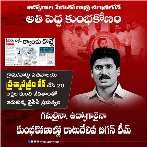 ఎపి లో గ్రామ సచివాలయ పరీక్షా పత్రాల లీకేజ్ వ్యవహారంలో ప్రభుత్వం పై తీవ్ర విమర్శలు వెల్లువెత్తుతున్నాయి. ఐతే జగన్ ప్రభుత్వం మాత్రం దీని పై నోరు మెదపడం లేదు. ఒక వైపు లీకేజి విషయమై ప్రతిపక్ష టీడీపీ ప్రభుత్వాన్ని నిలదీస్తుండగా, తాజాగా జనసేన పార్టీ జగన్ ప్రభుత్వాన్ని టార్గెట్ చేసింది. "పారదర్శకతతో, నిష్పక్షపాతంతో పరీక్షలు నిర్వహించాం అని డైలాగులు చెప్పి భారీ కుంభకోణానికి తెర లేపిన జగన్ ప్రభుత్వం" అంటూ తీవ్ర వ్యాఖ్యలతో ట్వీట్ చేసింది. అది " గనులైనా, ఉద్యోగాలైనా కుంభకోణాల్లో రాటుదేలిన జగన్ టీం" అంటూ ఆ పార్టీ ట్వీట్ చేసింది. దాదాపు 21 లక్షల మంది అభ్యర్థుల భవితవ్యంతో ముడిపడిన ఈ వ్యవహారం పై స్పష్టమైన వివరణ ఇవ్వాల్సిన రాష్ట్ర ప్రభుత్వం మిన్నకుండిపోవడం మరింత అనుమానాలకు తావిచ్చేలా చేస్తోంది.