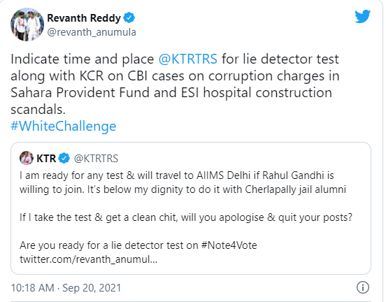 తాజాగా, టీపీసీసీ అధ్యక్షుడు రేవంత్రెడ్డి విసిరిన వైట్ ఛాలెంజ్పై మంత్రి కేటీ రామారావు స్పందించారు. ‘‘ఎలాంటి పరీక్షలకైనా సిద్ధంగా ఉన్నా. కాంగ్రెస్ తరఫున రాహుల్ గాంధీ సిద్ధమేనా? రాహుల్ ఒప్పుకుంటే ఢిల్లీ ఎయిమ్స్లో పరీక్షలకు సిద్ధం. చర్లపల్లి జైలుకు వెళ్లొచ్చిన వారితో నా స్థాయి కాదు. క్లీన్చిట్ వస్తే రేవంత్ క్షమాపణ చెప్పి పదవులు వదులుకుంటారా? ఓటుకు నోటు కేసులో లైడిటెక్టర్ పరీక్షలకు సిద్ధమా’’ అని కేటీఆర్ ట్విటర్లో సవాల్ విసిరారు.