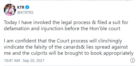 రచ్చ బాగా ముదరడంతో కేటీఆర్ రూట్ మార్చినట్టున్నారు. ‘‘ఉద్దేశపూర్వకంగా నాపై దుష్ప్రచారం చేస్తున్నారు. న్యాయస్థానంలో పరువు నష్టం దావా దాఖలు చేశాను. వారిపై కోర్టు చర్యలు తీసుకుంటుందని విశ్వసిస్తున్నాను’’ అంటూ కేటీఆర్ ట్వీట్ చేశారు.