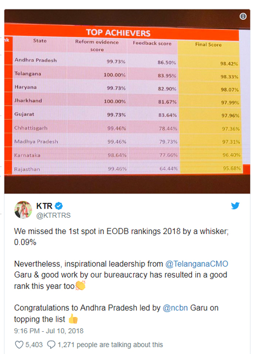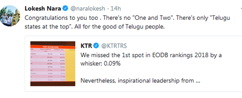 నెంబర్ వన్ స్థానంలో నిలిచిన ఆంధ్రప్రదేశ్ కు శుభాకాంక్షలు చెబుతూనే కేటీఆర్ జస్ట్ మిస్ అన్నారు. కేవలం 0.09 శాతం తేడాతో ఫస్ట్ ర్యాంక్ మిస్సయ్యాం అన్నారు. దానికి స్పందించిన లోకేష్ రెండు తెలుగు రాష్ట్రాలు అగ్రస్థానంలో వున్నాయన్నారు! ఇది తెలుగు ప్రజల మంచికే తప్ప ర్యాంకుల రేస్ మన మధ్య ఏం లేదని అభిప్రాయం వెలిబుచ్చారు. ఇది నిజంగా పరిణతి చెందిన సమాధానం అనే చెప్పాలి. నిజానికి కేటీఆర్ ఆంద్రప్రదేశ్ కు శుభాకాంక్షలు చెప్పటం హర్షనీయం. అంతకంటే ఎక్కువగా రెండు తెలుగు రాష్ట్రాలు ఒక్కటేనన్న భావం ధ్వనించేలా లోకేష్ స్పందించటం మరింత ఆనందదాయకం. ఈ సందర్భంగా మనం ఒక్కసారి విభజనకు ముందు పరిస్థితి గుర్తు చేసుకుంటే ఇప్పుడు ఆశ్చర్యమనిపిస్తుంది. అప్పట్లో తెలంగాణ ఏర్పాటుకు అనుకూలంగా చంద్రబాబు లేఖ ఇచ్చినా కూడా కేసీఆర్ పదే పదే టీడీపీని టార్గెట్ చేసేవారు. అప్పుడు తెలుగు దేశం నేతలు ఘాటుగానే ప్రతి దాడి చేసేవారు. అటువంటి స్థితి నుంచీ ఇప్పుడు ఒకరికి ఒకరు శుభాకాంక్షలు చెప్పుకుని వెన్నుతట్టి ప్రొత్సహించుకునే స్థితికి రావటం ఖచ్చితంగా గుణాత్మక మార్పే!