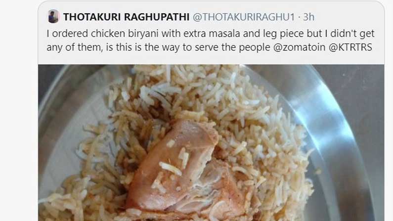 తోటకూరి రఘుపతి అనే వ్యక్తి తాను జొమాటో ద్వారా చికెన్ బిర్యానీ ఆర్డర్ చేశానని తెలిపాడు. ఎక్స్ ట్రా మసాలా, లెగ్ పీస్ తో బిర్యానీ కావాలని తాను ఆర్డర్ చేస్తే, అవేవీ లేకుండానే తనకు చికెన్ బిర్యానీ డెలివరీ ఇచ్చారని ఆ వ్యక్తి వాపోయాడు. జొమాటో వాళ్లు ప్రజలకు ఇలాగేనా సేవ చేసేది? అంటూ ఆ వ్యక్తి మంత్రి కేటీఆర్ ను ట్విట్టర్ లో ట్యాగ్ చేశారు.