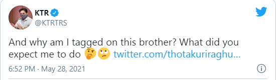 దీనిపై కేటీఆర్ వెంటనే స్పందించారు. దీనికి నన్నెందుకు ట్యాగ్ చేయడం బ్రదర్? ఈ విషయంలో నా నుంచి మీరు ఏం ఆశిస్తున్నారు? అని ప్రశ్నించారు. నెట్టింట ఈ వ్యాఖ్యలు వైరల్ గా మారాయి. వేల సంఖ్యలో లైకులు, వందల సంఖ్యలో రీట్వీట్లు వస్తున్నాయి.
