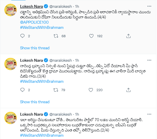 నాదెండ్ల బ్రహ్మంని నిన్నటి నుంచి స్టేషన్ల చుట్టూ తిప్పి..తిప్పి ఏదో చేయాలనే మీ ప్లాన్ బెడిసికొట్టడంతో కొత్త డ్రామా మొదలుపెట్టారు. నాదెండ్ల బ్రహ్మంపై ఈగ వాలినా మీదే బాధ్యత డీజీపీ గారు. చట్టాన్ని అతిక్రమించి చేసిన ప్రతీ అరెస్టుకి, పాల్పడిన ప్రతీ అరాచకానికీ న్యాయస్థానాల ముందు తలదించుకుని దోషిగా నిలబడేందుకు సిద్ధంగా ఉండండి.. అంటూ లోకేష్ ఫైర్ అయ్యారు.