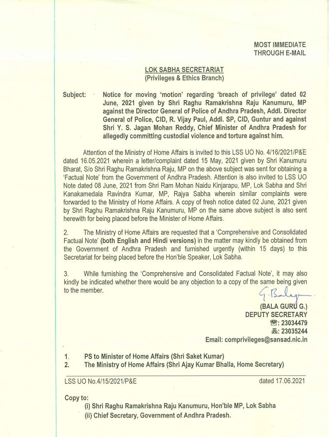 నర్సాపురం ఎంపీ రఘురామకృష్ణరాజు ఇచ్చిన సభాహక్కుల నోటీసుపై లోక్సభ స్పీకర్ కార్యాలయం స్పందించింది. మే 14న తనని అరెస్ట్ చేయడం, ఆ తర్వాత తీవ్రంగా హింసించడంపై స్పీకర్ ఓం బిర్లాకు రఘురామ జూన్ 2న ఫిర్యాదు చేశారు. ఏపీ సీఎం జగన్, డీజీపీ, సీఐడీ ఏడీజీ, గుంటూరు అడిషనల్ ఎస్పీ విజయ్ పాల్పై ఎంపీ రఘురామ సభా హక్కుల ఉల్లంఘన నోటీసు ఇచ్చారు.