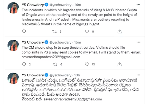 వైసీపీ వేధింపులకు భయపడకుండా బాధితులు పోలీస్ స్టేషన్లో ఫిర్యాదు చేయాలని ఎంపీ సుజనా చౌదరి సూచించారు. ఆ ఫిర్యాదు కాపీలు తనకు పంపాలని.. బాధితులకు అండగా ఉంటానని సుజనా చౌదరి భరోసా ఇచ్చారు. ఆ కాపీలను saveandhrapradesh2022@gmail.comకు పంపించాలంటూ ట్వీట్ చేశారు.