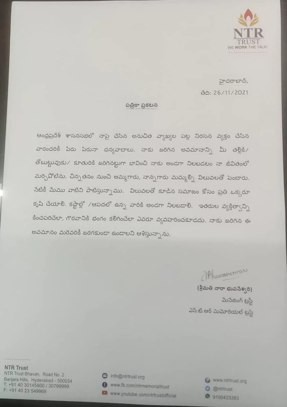 ‘నాకు జరిగిన అవమానాన్ని మీ తల్లి, తోబుట్టువు, కూతురికి జరిగినట్లుగా భావించి నాకు అండగా నిలబడటం నా జీవితంలో మర్చిపోలేను. చిన్నతనం నుంచి అమ్మానాన్న మమ్మల్ని విలువలతో పెంచారు. నేటికీ మేము వాటిని పాటిస్తున్నాం. విలువలతో కూడిన సమాజం కోసం ప్రతి ఒక్కరూ కృషి చేయాలి. కష్టాలు, ఆపదలో ఉన్న వారికి అండగా నిలబడాలి. ఇతరుల వ్యక్తిత్వాన్ని కించపరిచేలా, గౌరవానికి భంగం కలిగించేలా ఎవరూ వ్యవహరించకూడదు. నాకు జరిగిన ఈ అవమానం మరెవరికీ జరగకుండా ఉండాలని ఆశిస్తున్నాను’’ అని భువనేశ్వరి తన ప్రకటనలో పేర్కొన్నారు.