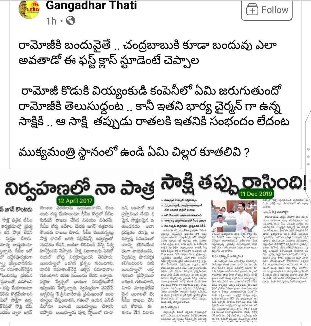 భారత్ బయోటెక్ పై సీఎం జగన్ చేసిన కామెంట్లపై సోషల్ మీడియాలో నెటిజన్లు కౌంటర్లు వేస్తున్నారు. కృష్ణ ఎల్లా రామోజీకి బంధువైతే చంద్రబాబు ఎలా బంధువు అవుతాడో ఈ ఫస్ట్ క్లాస్ స్టూడెంటే చెప్పాలంటూ ప్రశ్నిస్తున్నారు. రామోజీ కొడుకు వియ్యంకుడి సంస్థలో ఏం జరుగుతుందో రామోజీకి తెలుస్తుందట.. కాని తన భార్య భారతీ రెడ్డి చైర్మెన్ గా ఉన్న సాక్షిలో ఏం జరుగుతుందో జగన్ రెడ్డికి తెలియదట అంటూ సెటైర్లు వేస్తున్నారు. సాక్షిలో ఏం రాస్తున్నారో తనకు తెలియదంటూ గతంలో జగన్మోహన్ రెడ్డి చేసిన కామెంట్లను సోషల్ మీడియాలో పోస్టు చేస్తూ కౌంటరిస్తున్నారు కొందరు నెటిజన్లు.